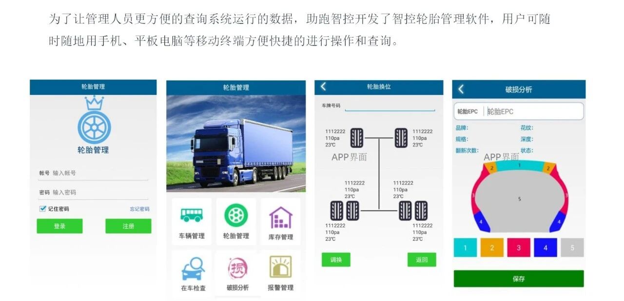 “助跑智控”轮胎全生命周期系统是车辆行驶安全部件产品和一套完整的轮胎管理系统的组合——通过对轮胎在使用过程中的各种状态进行数据采集和统计,分析轮胎使用周期内的各项信息和数据,并实时监控车辆轮胎的压力、温度、行驶里程、轨迹、换位、修补与更换状态,从而提高车辆的运营安全性、保障管理效率和降低运营成本。