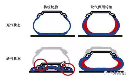 一般轮胎在失去轮胎压力的时候,轮胎在眨眼间就能像烂泥一样脱离轮毂,仅靠轮毂来与地面接触,易导致交通事故。而缺气保用轮胎与一般轮胎最大的不同就是在于它拥有非常好的韧性和支撑性的胎壁。这样的设计可以帮助轮胎在发生爆胎或者突然泄气的情况下,保证轮胎与轮毂还可以结合起来并给予车辆一定的支撑,从而保证车辆的的安全。