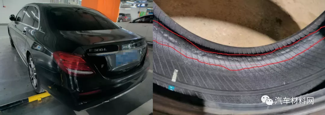 图为奔驰E300L,轮胎是倍耐力防爆胎,在轮胎扎胎的情况下继续行驶了30公里,轮胎内侧受到碾压产生裂纹。